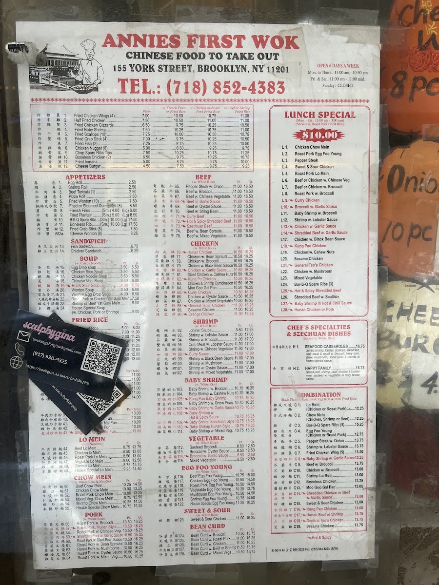 Welcome to the vibrant world of Annie's First Wok, a cozy Chinese eatery nestled in the heart of Brooklyn at 155 York St. Known for its generous portions and wallet-friendly prices, Annie’s promises a delightful escape for those craving classic American-style Chinese cuisine that doesn’t skimp on flavor.